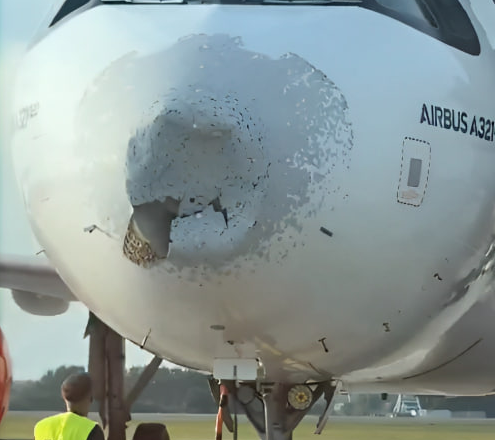 Grad vážně poškodil nejen trup letadla, ale i jeho okna.